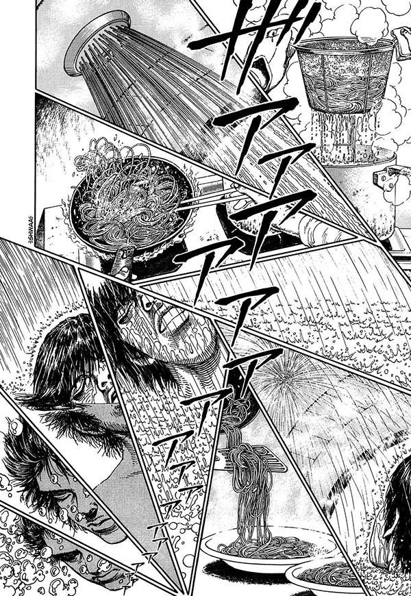 Anyway, onto the manga. It's such a shame it was never finished, but I think it's a worthwhile read anyway, and with the way it ended - you could interpret it as a true ending. The art and the panelling is insane. The way the story flows through it is amazing, and I loved it all. The story is basically one big trip, and whether the storytelling is linear or non-linear is up to how you interpret it. I loved the part with the spaghetti and the flowing water merging into one event, the manga is FULL of fun stuff like that, and I mean, just look at it.