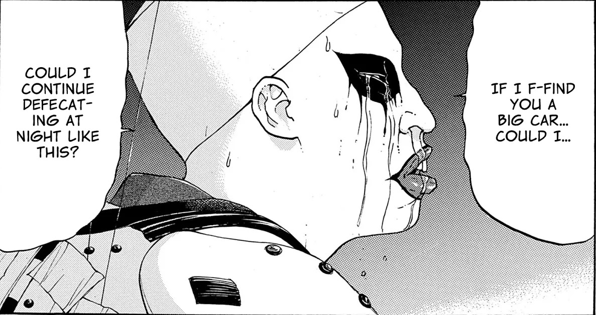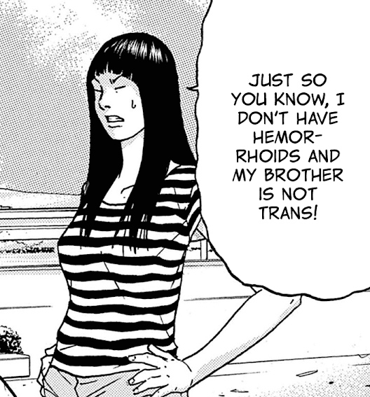 The art definitely has improved compared to Himizu. Himizu was by no means bad, but at times the characters would look pretty disproportionally buff and big. I feel like Furuya's recognizeable style stayed (I kind of grew to like the exaggerated faces now, they're also a bit more toned down...) which is nice. General panelling and physical comedy and stuff is really well done. I also really loved all the creepy monster designs. Lastly I think this manga really excels at character interaction and silly communication. I don't know, I just love random haha humor sometimes.
